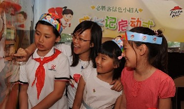 京城首家“必勝客綠色小超人主題餐廳”近日正式揭幕。大學(xué)生志愿者們帶領(lǐng)來(lái)自呼家樓小學(xué)的首批“必勝客綠色小超人”在這里開(kāi)始了一場(chǎng)“畫手絹游戲”。