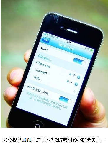 “現在用智能手機、平板電腦的人越來越多,店里有無線網絡,也是給客人提供方便。”舊城一家茶餐廳店長稱,如果無線網不設置密碼,周圍“蹭網”的人會更多,而帶寬是不變的,這樣店里的客人使用無線時速度就會減慢。當然餐廳提供wifi也帶來一些不便。該店長告訴記者,有些蹭網鐵粉經常到餐廳一帶消費,對各家店鋪的wifi密碼熟記于心,有時甚至出現在別家消費蹭隔壁的wifi,造成本店消費者上網速度緩慢,該店長對此表示無奈,“店里也不能為了防止‘蹭網’不斷更換密碼,這樣會對本店消費者造成困擾,更重要的是,飯店提供無線網絡,本身就是增加‘黏性’,希望更多消費者選擇本店就餐。”