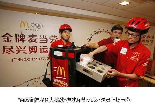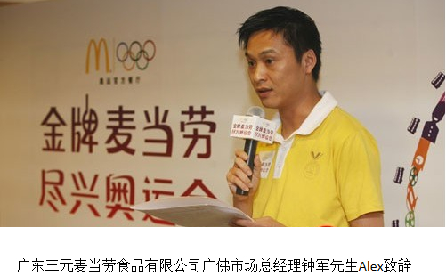 廣東三元麥當勞食品有限公司廣佛市場總經理鐘軍表示,麥當勞一貫堅持金牌標準,以金牌服務及金牌食品,不僅贏得了全球消費者的信賴,也贏得了與奧運合作36年的榮譽。作為奧運會的全球合作伙伴和官方合作餐廳,麥當勞今年不僅在倫敦為運動員及來賓提供金牌品質的食品和服務,也將為中國消費者打造高品質、零時差、最臨場的金牌奧運用餐體驗。"