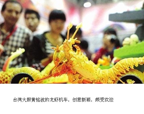 展臺上還有西瓜雕刻的孔雀、鹽巴堆成的七巧板、龍蝦殼做的哈雷摩托……這些充滿創意的食材造型吸引了很多人。