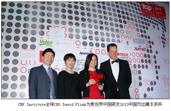 近日,由全球人力資源管理、領導力和戰略領域的知名調研機構CRF Institute舉辦的2013中國杰出雇主頒獎盛典上,麥當勞中國憑借培訓和發展、職業發展和企業文化管理上的杰出表現從300家公司中脫穎而出,第三次被CRF正式授予“中國杰出雇主”認證。