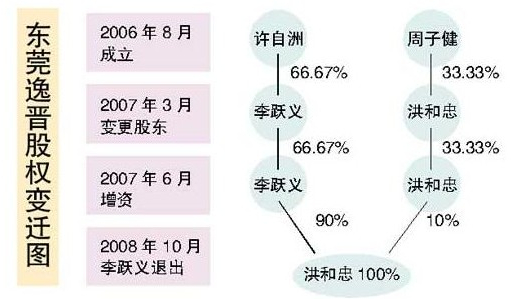 那么李躍義又是何時介入到東莞逸晉的呢?據東莞逸晉的公司決議,在2007年3月的一次股東會上,許自洲、周子健以原出資金額將手上的全部股權分別轉給了李躍義和洪和忠。轉讓后,李躍義獲得了許自洲手上的66.67%股權。隨即,公司章程也進行了修改,李躍義擔任了公司唯一一名執(zhí)行董事、經理和法定代表人。