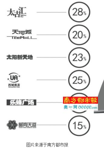 記者粗略統計了一下,按面積規模統計,正佳廣場的餐飲規模占比高達30%,太古匯、西城都薈、樂峰廣場的占比則超過25%;另外天河城、太陽新天地的占比超過20%。