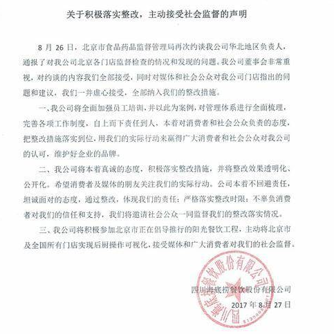 海底撈再發聲明:鍋我背、錯我改、請廣大民眾監督