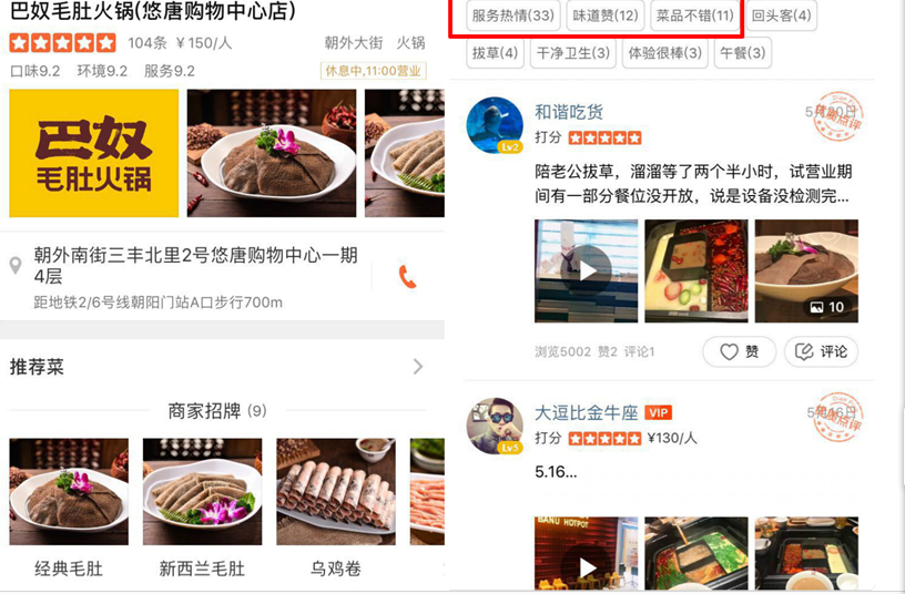 一周后,記者再次來到北京店就餐,店內(nèi)餐位已經(jīng)全部開放,仍然供不應(yīng)求。據(jù)巴奴門店負責(zé)人透露,巴奴北京店定位為毛肚專家旗艦店。試營業(yè)當(dāng)天賣了100多桌,此后幾天的數(shù)據(jù)都有增加。而從顧客的綜合評價來考核,截至發(fā)稿,巴奴北京店在大眾點評上已得到五星好評。97條評價中,好評89條,中評6條,差評2條。好評所夸贊的地方主要在服務(wù)、菜品、店面風(fēng)格、鍋底等方面,其中超過30位顧客點了“服務(wù)好”這個標(biāo)簽,而中評和差評指出的問題在價格偏貴(記者實測,人均消費150左右)、餐位預(yù)定等方面。