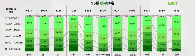 趕集網(wǎng)調(diào)研數(shù)據(jù)顯示,2018年95后應屆畢業(yè)生期望薪資的均值為6174元,其中9.5%的畢業(yè)生希望月薪超過10000元,而40%的畢業(yè)生對月薪的期望都超過8000元。與往屆生相比,應屆生對薪資的期望更高。然而,95后應屆畢業(yè)生的實際薪資平均值為5429元,80%的畢業(yè)生實際薪資在8000元以下,這說明理想與現(xiàn)實仍然存在一定差距。