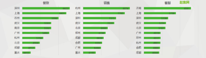 從薪資方面來看,深圳餐飲企業(yè)為95后應屆畢業(yè)生提供的平均薪資水平最高,平均達6623元。其次是上海和蘇州分別為6431元和5998元。銷售類人才的薪資水平方面,杭州、上海、深圳排在前三位,分別為8074元、7795元和7315元。客服類人才薪資,濟南以6591元明顯高于其他城市,上海和深圳以5759元和5338元分列第二、第三位。一線城市的客服類人才需求量雖然逐年下降,但是因為當?shù)匦劫Y水平的差異,一線城市客服類薪資仍保持在較高水平。城市與薪酬,一直是求職者求職的的主要考量因素。做好職業(yè)規(guī)劃,根據(jù)職業(yè)目標來選擇相應的城市與崗位,十分重要。