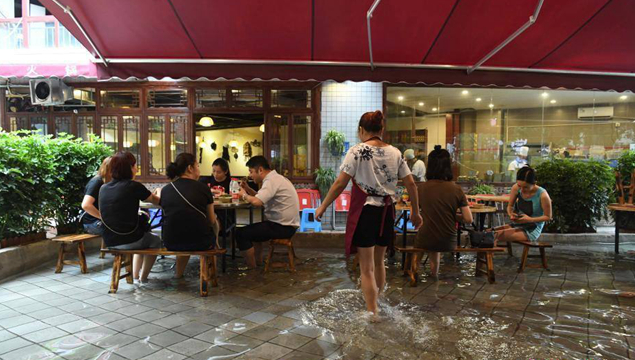 老板: 當(dāng)時是因為我們在這沖地,每天晚上都要進(jìn)行沖地,因為太熱了要減少地氣,所以我們搞了一個這種火鍋,覺得把腳打濕了挺涼快的。
