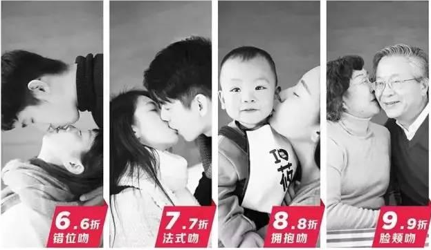 “西貝”為“親嘴打折節(jié)”準(zhǔn)備了一個(gè)極其吸引眼球的廣告語(yǔ)“吻得越深,折扣越大”,并設(shè)計(jì)了四種不同的親吻姿勢(shì)和對(duì)應(yīng)折扣。別出心裁的打折方式,給了中國(guó)人一次公開(kāi)高調(diào)秀恩愛(ài)的機(jī)會(huì)!
