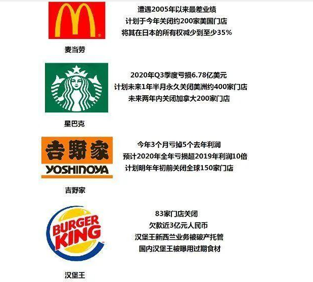 在新冠疫情的影響下,不只是吉野家關店自救,麥當勞關店200家,星巴克關店400家……為應對危機,曾經(jīng)在全球“開疆拓土”的國際餐飲知名品牌紛紛關店。