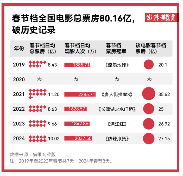 國家電影局2月18日發(fā)布的數(shù)據(jù)顯示,2024年國內(nèi)春節(jié)檔電影票房達(dá)80.16億元,創(chuàng)造了新的春節(jié)檔票房紀(jì)錄,觀影人次為1.63億。
